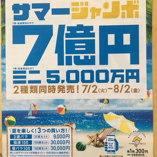 7/3(水)~8/2(金)まで販売いたします。 販売する宝くじは 1等前後賞合わせて7億円が当たる「サマージャンボ宝くじ」 と 1等前後賞合わせて5,000万円が当たる「サマージャンボミニ」の2種類です。